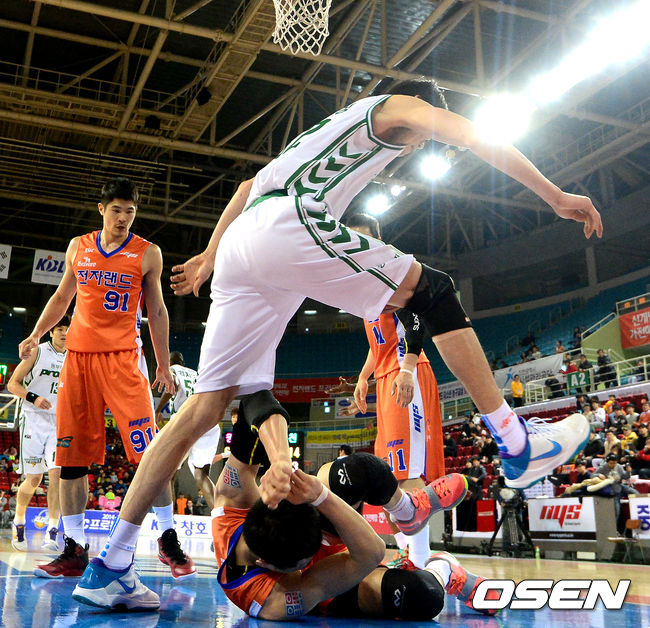 1쿼터 동부 김주성과 전자랜드 이현호가 리바운드를 다투며 착지하고 있다.