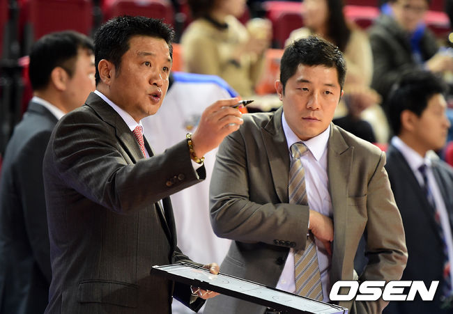 1쿼터 전자랜드 유도훈 감독이 작전을 지시하고 있다.