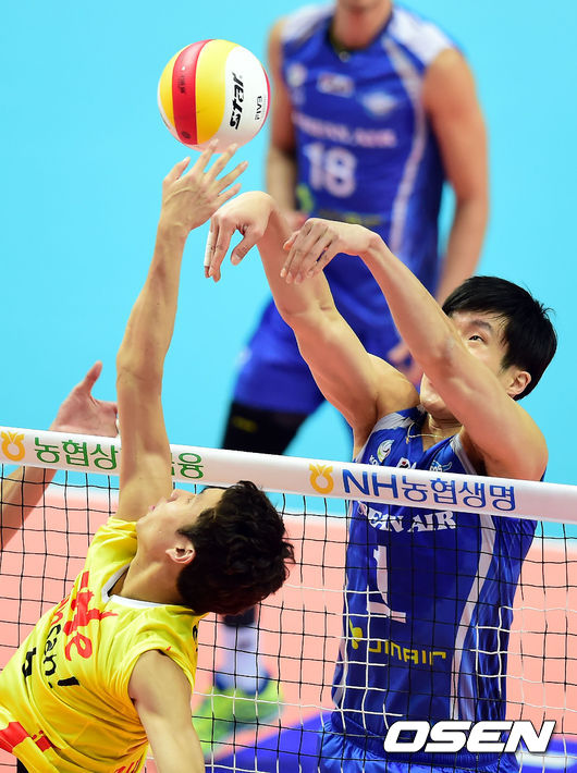 10일 오후 안산 상록수체육관에서 열린 '2014-2015 NH농협 V-리그' OK저축은행과 대한항공의 경기 2세트 OK 저축은행 이민규와 대한항공 신영수가 네트 플레이를 하고 있다.