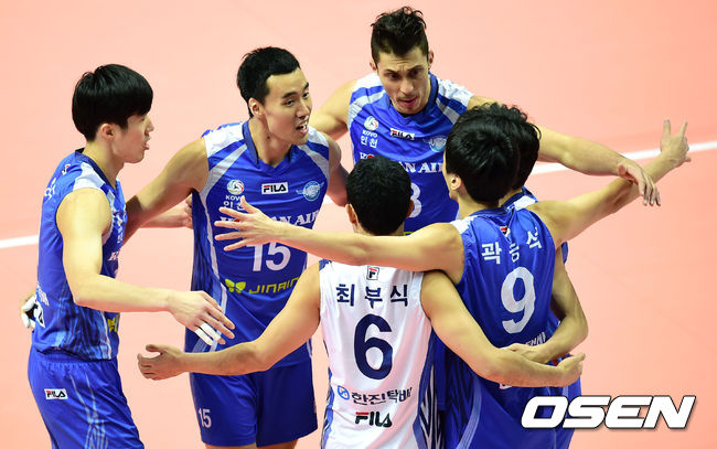 10일 오후 안산 상록수체육관에서 열린 '2014-2015 NH농협 V-리그' OK저축은행과 대한항공의 경기 1세트 득점을 올린 대한항공 선수들이 기뻐하고 있다.