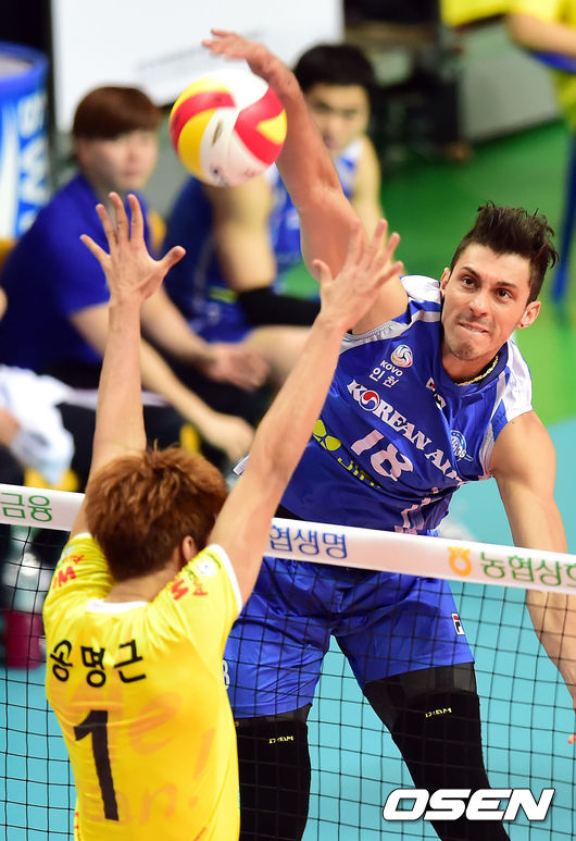 10일 오후 안산 상록수체육관에서 열린 '2014-2015 NH농협 V-리그' OK저축은행과 대한항공의 경기 2세트 대한항공 산체스가 스파이크를 때리고 있다.