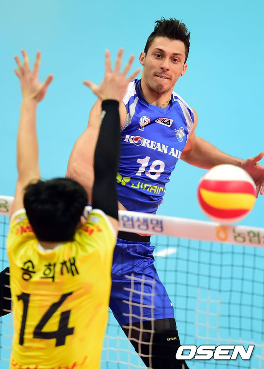 10일 오후 안산 상록수체육관에서 열린 '2014-2015 NH농협 V-리그' OK저축은행과 대한항공의 경기 2세트 대한항공 산체스가 대각선 공격을 시도하고 있다.