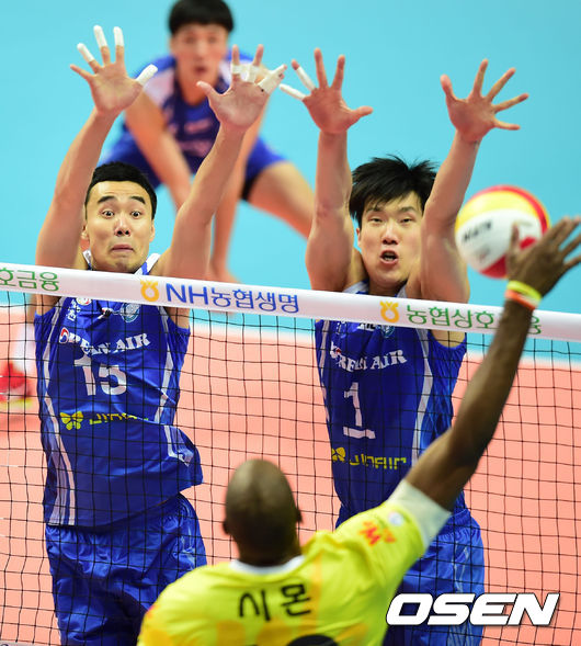 10일 오후 안산 상록수체육관에서 열린 '2014-2015 NH농협 V-리그' OK저축은행과 대한항공의 경기 2세트 대한항공 김형우와 신영수가 블로킹을 시도하고 있다.