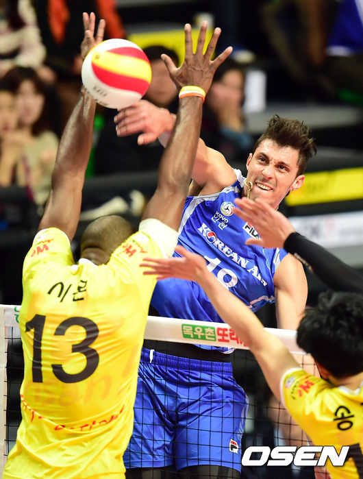 10일 오후 안산 상록수체육관에서 열린 '2014-2015 NH농협 V-리그' OK저축은행과 대한항공의 경기 대한항공 산체스가 스파이크를 때리고 있다.