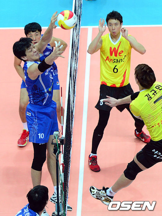 10일 오후 안산 상록수체육관에서 열린 '2014-2015 NH농협 V-리그' OK저축은행과 대한항공의 경기 대한항공 이영택이 OK저축은행 김규민의 공격을 막아내고 있다.