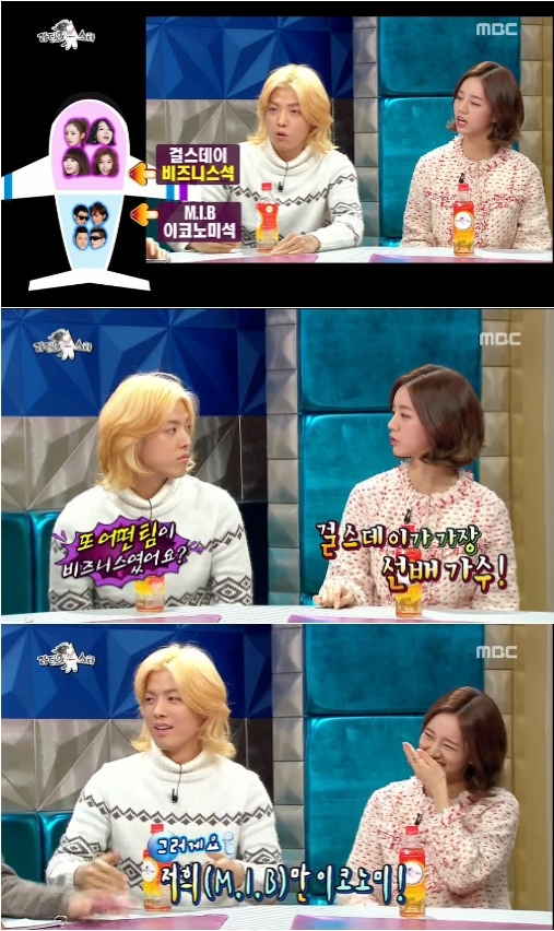각 멤버들의 호텔 방을 스위트룸으로 업그레이드 해줬다는 이야기에 MC들은 비행기 자리에 대해서도 물었다. 강남은 "MIB는 이코노미를 타고 갔다. 데뷔 연차로 나눴다. 걸스데이까지 비즈니스였다"고 말했다. 이에 혜리는 "당시 걸스데이가 가장 선배였다. 걸스데이와 달샤벳, MIB 3팀이 간 해외 공연이었다. 달샤벳도 연장자 순으로 나눠 절반만 비즈니스를 탔다"고 설명했다.