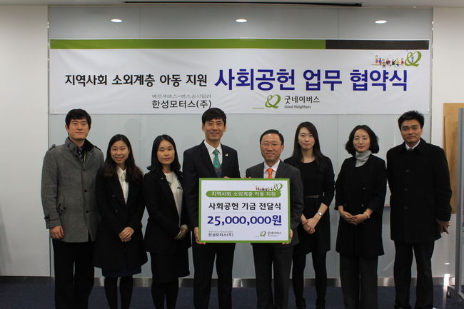 한성모터스 반준호 이사는 “한성모터스는 굿네이버스와의 협약을 통하여 부산 지역 사회공헌사업을 시작하게 되어 매우 기쁘다. 후원의 규모보다 더 중요한 것은 지속성이라고 생각한다. 앞으로도 사회공헌을 위한 여건을 마련하여 지역사회 이웃들을 위해 지속적 후원할 수 있도록 노력하겠다”고 소감을 밝혔다.