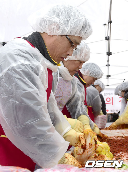 11일 오전 서울 강남구 개포동 남부적십자혈액원에서 열린 'KBO 사랑의 김장나눔' 봉사활동 행사에서 양해영 사무총장, 김인식 규칙위원장, 허구연 야구발전실행위원장이 김치를 담그고 있다.