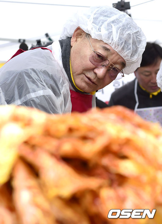 11일 오전 서울 강남구 개포동 남부적십자혈액원에서 열린 'KBO 사랑의 김장나눔' 봉사활동 행사에서 이광환 육성위원장이 김장을 하고 있다.