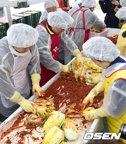 11일 오전 서울 강남구 개포동 남부적십자혈액원에서 열린 'KBO 사랑의 김장나눔' 봉사활동 행사에서 김인식 규칙위원장, 허구연 야구발전실행위원장이 김장을 하고 있다.
