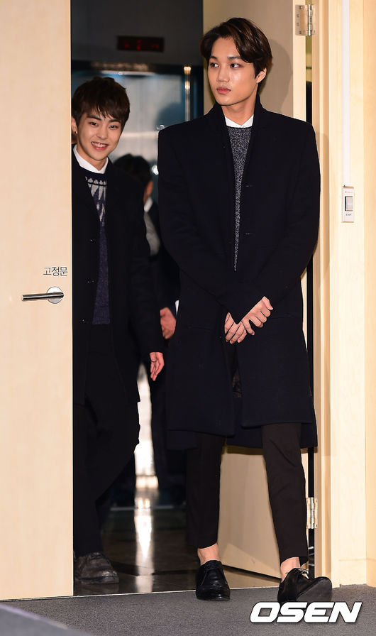11일 오전 서울 신문로 축구회관에서 진행된 대한축구협회(KFA)와 SM엔터테인먼트 업무협약(MOU) 체결식에서 엑소 시우민과 카이가 입장하고 있다