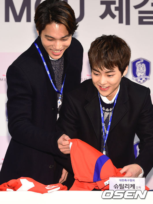 11일 오전 서울 신문로 축구회관에서 진행된 대한축구협회(KFA)와 SM엔터테인먼트 업무협약(MOU) 체결식에서 엑소 시우민과 카이가 유니폼을 챙기고 있다.