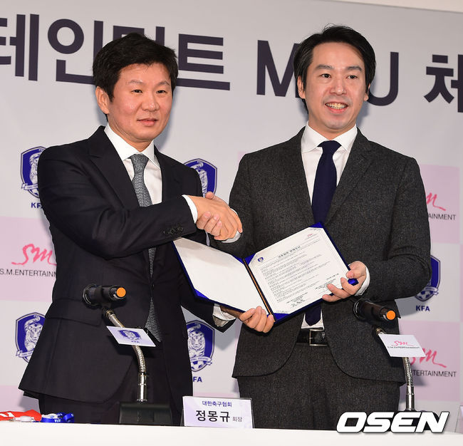 협회 관계자는 "대표팀 경기 때 SM 소속 가수가 노래를 만들거나 부르는 것을 하기 위한 MOU체결이다. 이번 체결로 팬들에게 더 가까이 다가가게 되는 계기가 될 것"이라고 설명했다./ soul1014@osen.co.kr