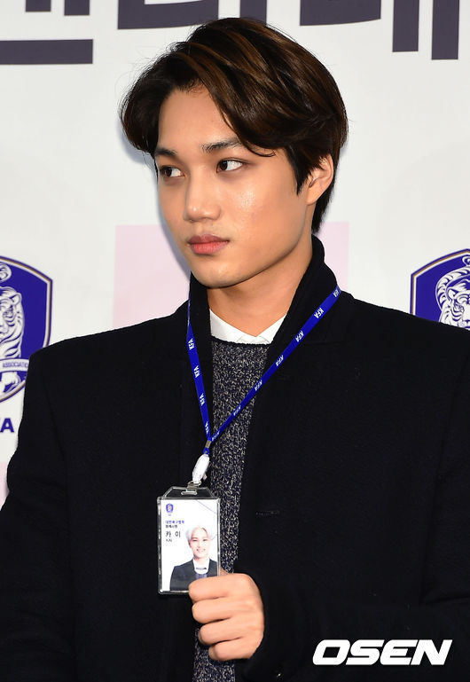 11일 오전 서울 신문로 축구회관에서 진행된 대한축구협회(KFA)와 SM엔터테인먼트 업무협약(MOU) 체결식에서 엑소 카이가 명예사원증을 보이고 있다.