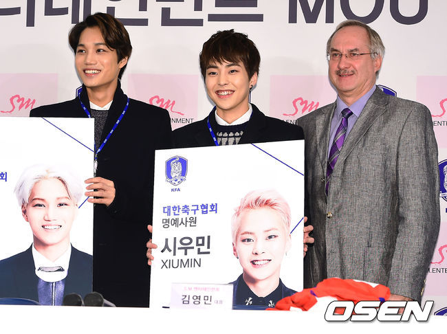 MOU 체결식에는 정몽규 회장, 울리 슈틸리케 감독, 김영민 SM엔터테인먼트 대표, EXO 멤버 카이, 시우민이 참석한다.