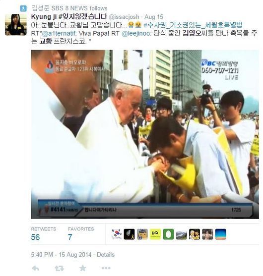 올 한 해 대한민국 트위터를 뜨겁게 달군 다섯 번째 순간은 프란치스코 교황의 시복미사가 있었던 8월 15일 오전이었다. 광화문에서 시복미사를 위해 이동하던 중 세월호 희생자 고 김유민 양의 아버지 김영오 씨의 손을 잡고 기도와 위로의 말을 건넨 장면은 온 대한민국을 뭉클하게 만든 순간이었다. 교황은 총 4박5일간의 방한일정 중 총 9개의 한국어 트윗을 올리며 화합의 메시지를 전달했다.