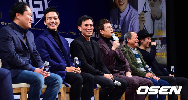 문제용 감독, 여진구, 유오성, 김정태, 김기천, 박두식(좌측부터)이 11일 오전 서울 신사동 CGV압구정에서 열린 영화 '내 심장을 쏴라'(감독 문제용) 제작보고회에 참석해 사회자의 질문에 답하며 미소짓고 있다.