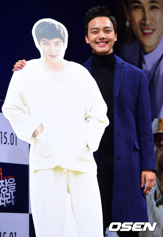 배우 여진구가 군 입대로 불참한 이민기의 등신대와 함께 11일 오전 서울 신사동 CGV압구정에서 열린 영화 '내 심장을 쏴라'(감독 문제용) 제작보고회에 참석해 포토타임을 갖고 있다.