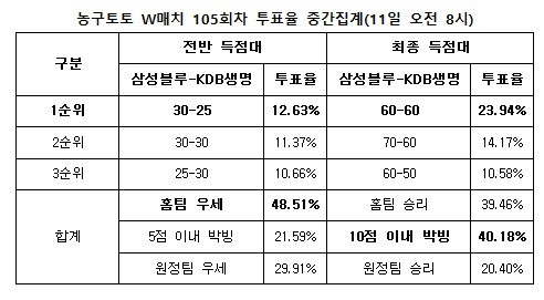 최종 삼성블루 60점대-KDB생명 60점대 23.94%로 최다 집계…12일(금) 오후 6시 50분 마감
