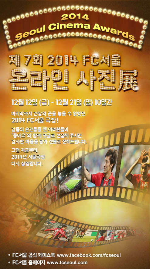 ‘2014 Seoul Cinema Awards’라는 타이틀로 진행되는 이번 FC서울 사진전은 올해로 7회째를 맞이한다. 특히 SNS 절대 강자 구단답게 온라인으로 진행되며 2014시즌을 보내며 겪었던 FC서울의 다양한 이야기들을 팬들에게 소개할 예정이다.