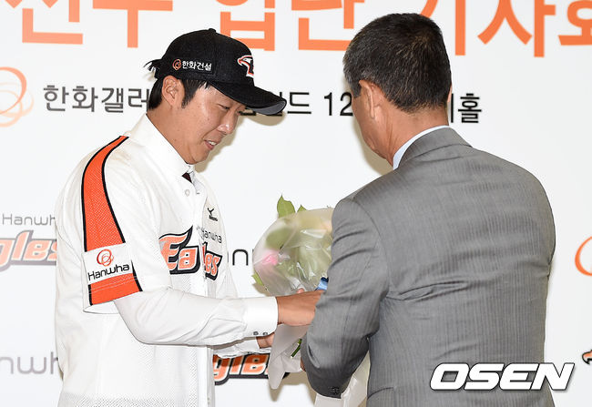입단식에는 외부 FA로 영입한 배영수, 권혁, 송은범을 비롯해 김성근 감독이 참석했으며 선수 대표로 김태균, 안영면, 조인성이 함께하여 자리를 빛냈다. /sunday@osen.co.kr
