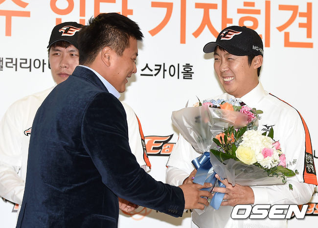 입단식에는 외부 FA로 영입한 배영수, 권혁, 송은범을 비롯해 김성근 감독이 참석했으며 선수 대표로 김태균, 안영면, 조인성이 함께하여 자리를 빛냈다. /sunday@osen.co.kr