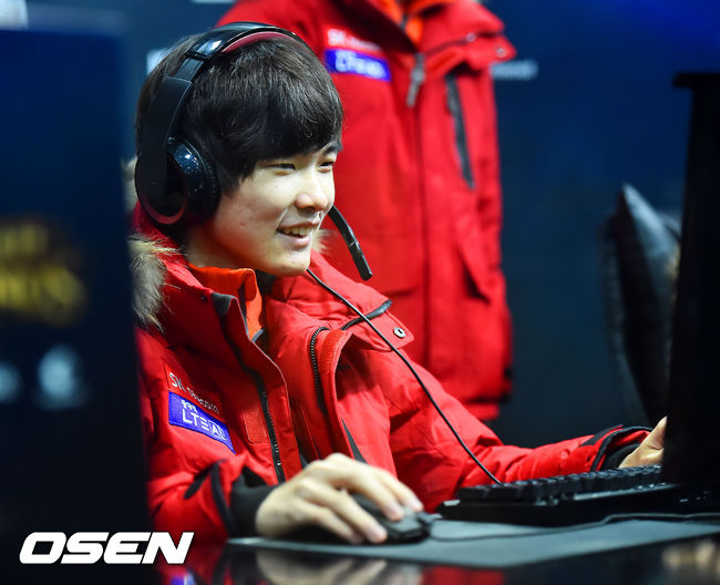11일 오후 서울 용산 아이파크몰 e스포츠 스타디움에서 '2015 LoL 챔피언스 코리아 프리시즌' 2주차 두번째 경기가 열릴 예정인 가운데 '페이커' 이상혁이 세팅 도중 환하게 미소짓고 있다.