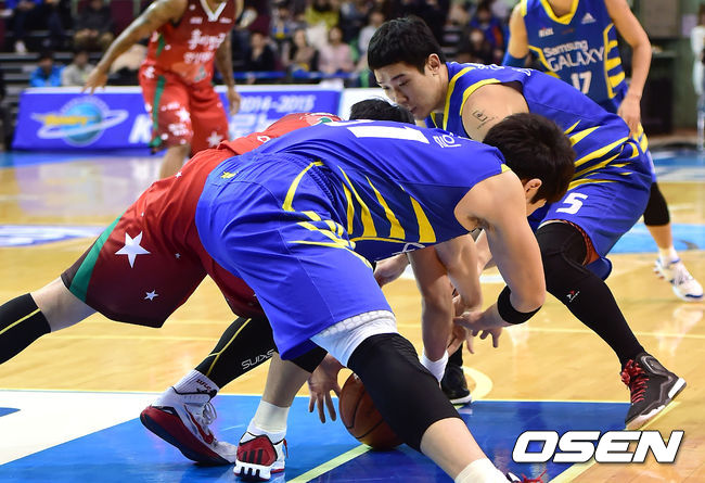 1쿼터 삼성 김준일과 KGC 양희종이 루즈볼 다툼을 벌이고 있다.