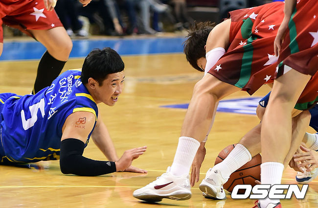 2쿼터 삼성 이정석과 KGC 박찬희가 루즈볼 다툼을 벌이고 있다.