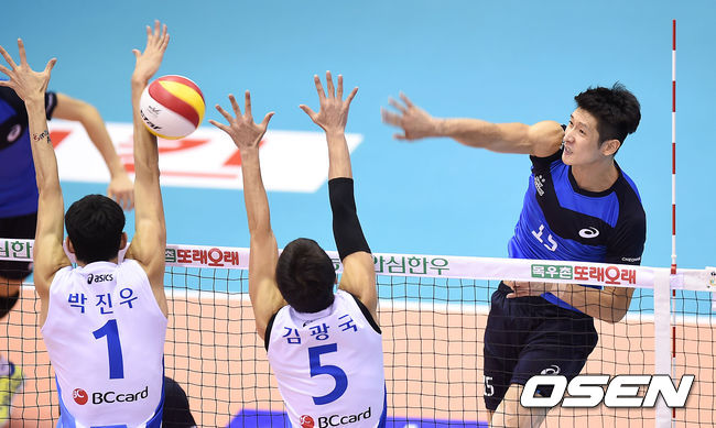 1세트 현대캐피탈 문성민이 우리카드의 블로킹 벽을 피해 공격을 시도하고 있다.