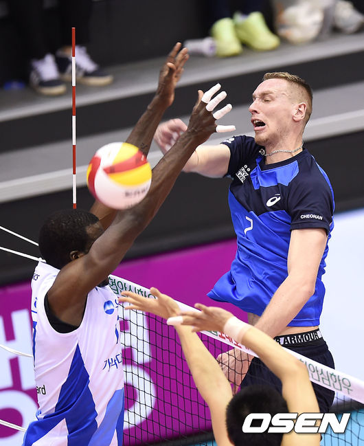 1세트 현대캐피탈 케빈이 우리카드의 블로킹 벽을 피해 공격을 시도하고 있다.