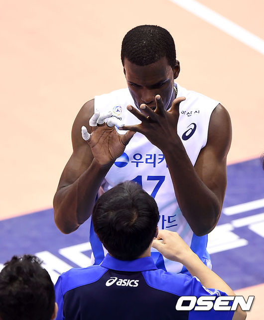 1세트 우리카드 까메호가 손가락 테이핑을 하고 있다.