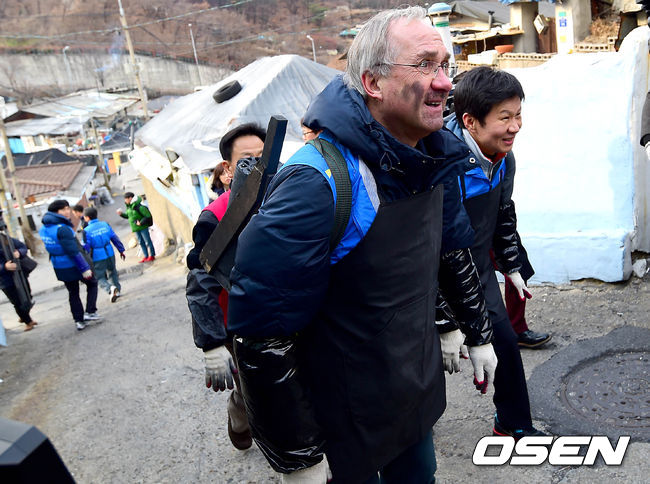 남자 축구국가대표팀 슈틸리케 감독과 정몽규 대한축구협회 회장이 지게를 지고 연탄을 나르고 있다.
