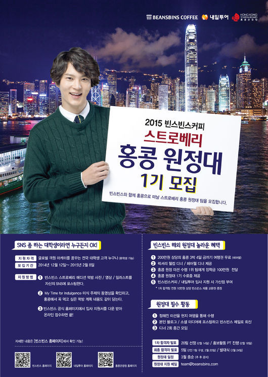 와플&커피 전문점 빈스빈스는 내일투어&홍콩관광청과 손잡고 12일부터 대학생 해외원정대인 '스트로베리 홍콩원정대 1기' 모집을 시작한다.