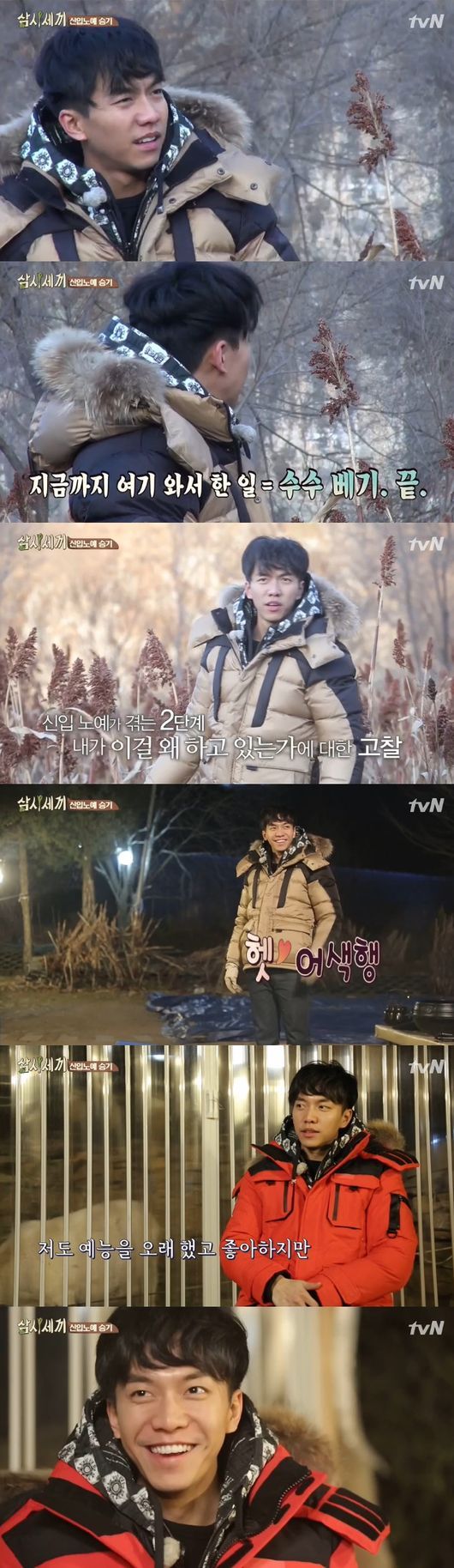 등장 5분 만에 수수밭에 투입된 이승기. 그는 “빡세긴 빡세네. 그런데 그냥 이렇게 베기만 하면 되나?”라고 질문하며 어색함을 감추지 못했다.