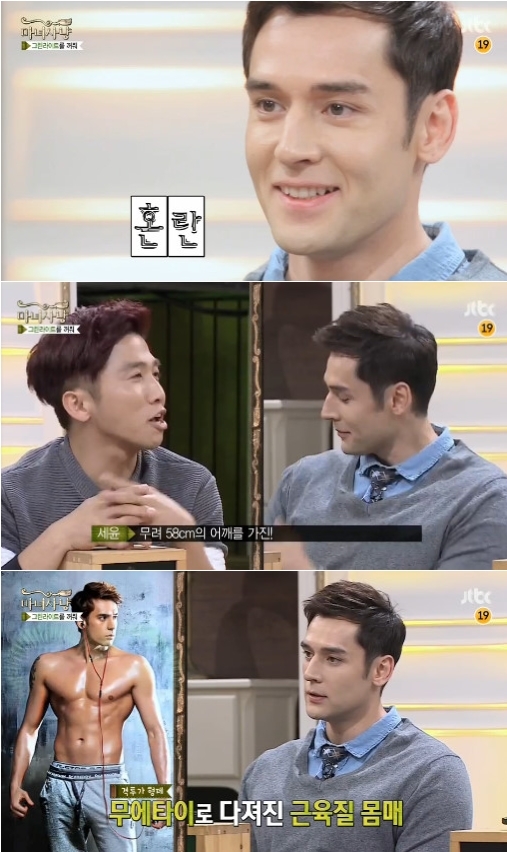 이날 MC들은 줄리엔강을 "연예계에서 큰 걸로 유명하다"며 "무려 58cm의 어깨를 가졌다"고 소개했다. 줄리엔강은 " 어깨가 커서 얼굴이 작아보인다"고 겸손하게 답했다. 성시경은 "그냥 외국인이여서가 아니라 운동으로 다져진 것"이라고 설명했다.