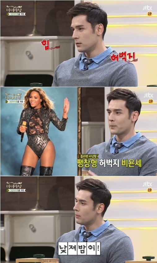 이날 줄리엔강은 이성을 볼 때 어떤 신체부위를 보느냐는 MC들의 질문에 "엉덩이와 허벅지를 본다"고 답했다. 줄리엔강은 "마르지 않고 단단한 허벅지를 좋아한다. 비욘세 같은 스타일이 그렇다"며 "요즘 한국 남성들도 달라졌다. 그래서인지 한국 여자들도 운동 열심히 한다"고 설명했다.