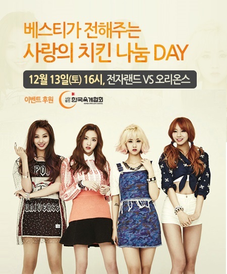 인천 전자랜드 프로농구단은 13일 오후 4시 고양 오리온스와의 홈경기에 베스티와 함께 하는 사랑의 치킨 나눔데이를 실시할 예정이다.