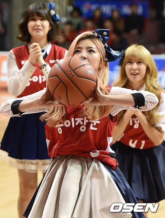 경기에 앞서 걸그룹 라붐 해인이 시투를 하고 있다.