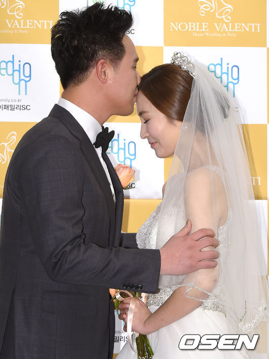 최정이 신부 나윤희의 이마에 입맞춤을 하고 있다.