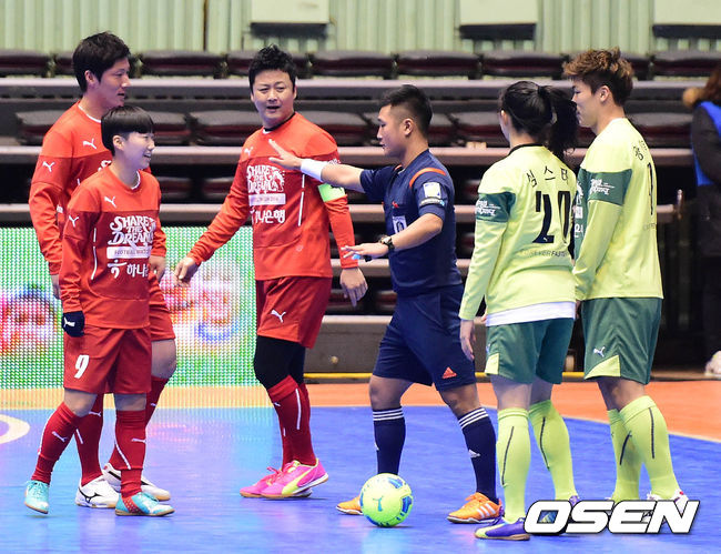 13일 오후 서울 잠실실내체육관에서 열린 '하나은행과 함께하는 Share the dream football match 2014' 자선축구경기에서 사랑팀과 희망팀 선수들이 말다툼을 하고 있다.