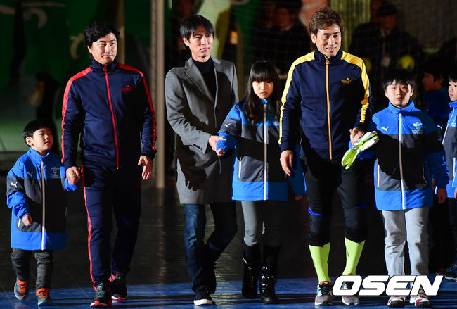 13일 오후 서울 잠실실내체육관에서 열린 '하나은행과 함께하는 Share the dream football match 2014' 자선축구경기에 안정환(왼쪽부터), 홍명보, 김병지가 입장하고 있다.