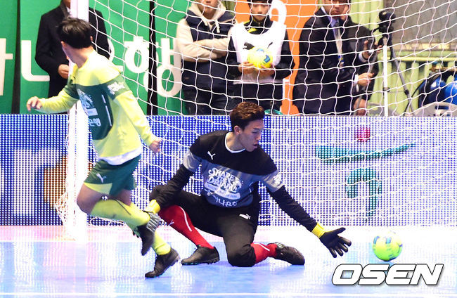 13일 오후 서울 잠실실내체육관에서 열린 '하나은행과 함께하는 Share the dream football match 2014' 자선축구경기에서 김민우가 골을 넣고 있다.