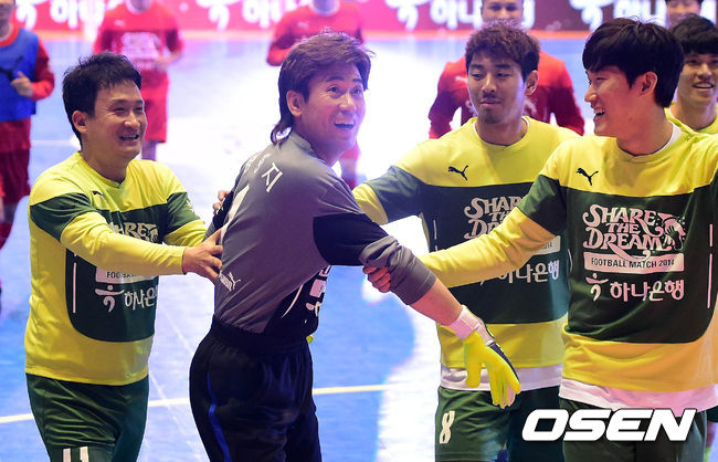 13일 오후 서울 잠실실내체육관에서 열린 '하나은행과 함께하는 Share the dream football match 2014' 자선축구경기에서 골키퍼로 나선 희망팀 김병지 감독이 선수들과 세레머니를 하고 있다.