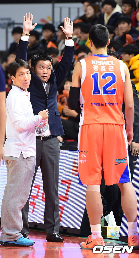 13일 오후 인천 삼산실내체육관서 열린 '2014-2015 KCC 프로농구' 인천 전자랜드와 고양 오리온스의 경기, 1쿼터 전자랜드 유도훈 감독이 정효근에게 작전 지시를 하고 있다.