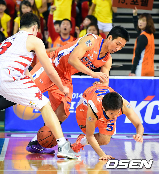 13일 오후 인천 삼산실내체육관서 열린 '2014-2015 KCC 프로농구' 인천 전자랜드와 고양 오리온스의 경기, 2쿼터 전자랜드 이현호와 정병국이 충돌하며 공을 놓치고 있다