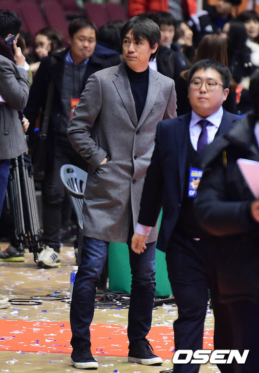 13일 오후 서울 잠실실내체육관에서 열린 '하나은행과 함께하는 Share the dream football match 2014' 자선축구경기 종료 후 홍명보가 인터뷰를 기다리고 있다.