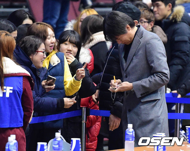 13일 오후 서울 잠실실내체육관에서 열린 '하나은행과 함께하는 Share the dream football match 2014' 자선축구경기 종료 후 홍명보가 팬들에게 사인을 해주고 있다.