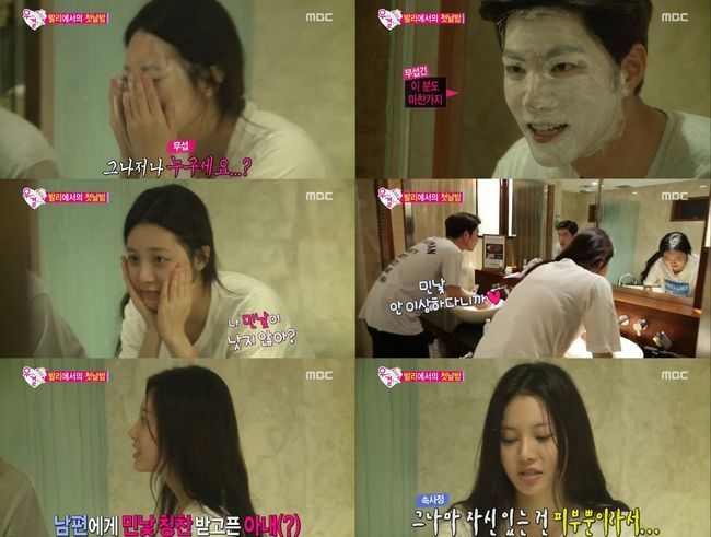 이들은 숙소에 도착, 게임으로 서로의 얼굴에 낙서를 했다. 이후 두 사람은 비눗칠하고 세면을 했다. 이 과정에서 유라의 민낯이 완전히 공개된 것. 유라는 무결점 피부를 선보여 눈길을 끌었다.