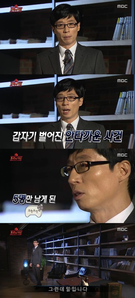 유재석이 "노홍철의 음주 논란이 있어 5명이 됐다"라며 김상중 패러디를 펼쳤다.